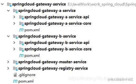 **① 此工程下有四个模块:一个注册中心,一个网关以及两个提供者