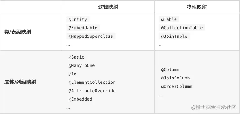 O/R的维度,可划分为针对类的逻辑注解和针对数据库的物理注解; - 从粒度维度,可划分为装对类/表的注解和针对属性/列的注解。