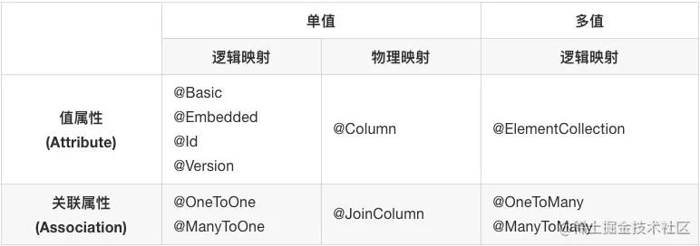 O/R的维度分组,可划分为针对类属性的逻辑注解和针对数据库列的物理注解; - 从属性类型的维度分组,可划分针对值(简单值或值对象)类型属性的注解和针对关联(实体)类型属性的注解;