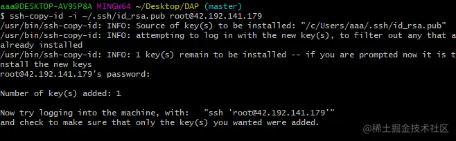 当然你也可以手动复制本地~/.ssh/id_rsa.pub(注意是pub结尾的公钥)文件内容追加到服务器~/.ssh/authorized_keys的后面(从命名可以看出该文件可以存储多个ssh key)