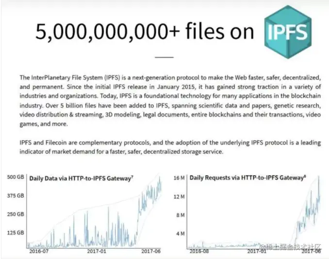 几年后协议实验室发行了与 IPFS 协议配套的激励层区块链项目 Filecoin,据资料显示,从项目诞生至 2017 年 6 月,IPFS 网络商已经存储了超过 50 亿份独特内容文件,且数据在持续增长。
