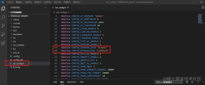 修改wifi账号和密码,找一个附近常用可以上网的WiFi账号和密码。需要修改2处,第一处是.config文件。第二处是iot_config.h文件。如下图所示: