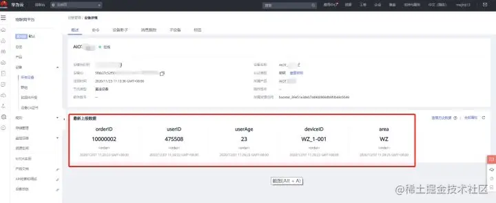 华为云⇒物联网⇒设备接入IoTDA⇒设备,可以看到有数据上来了,如下图显示: