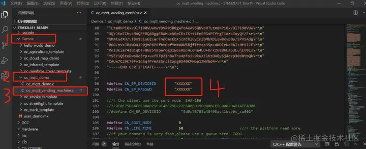 修改Demosoc_mqtt_demooc_mqtt_vending_machine.c文件,把云平台的设备ID和密码(之前在记事本保存好的),分别替换第98和第99的xxxxxx。