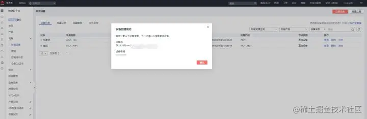 点击确认后,会提示设备创建成功,如下图所示。找个记事本把设备ID和密码保存起来待用。