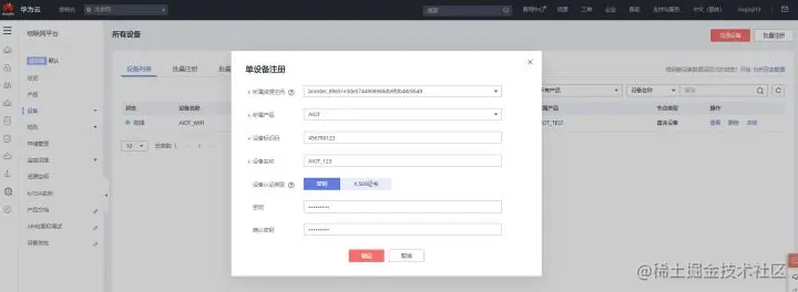 设备认证类型:密钥。