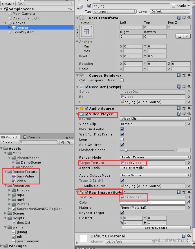VideoPlay 赵乾 2020-12-10 292 阅读1分钟 播放视屏 先右键创建Reader Texture 了解一下什么是Reader Texture www.jianshu.com/p/fa73c0f67… 优先关注下面的backVideo是我beijing中的视频
