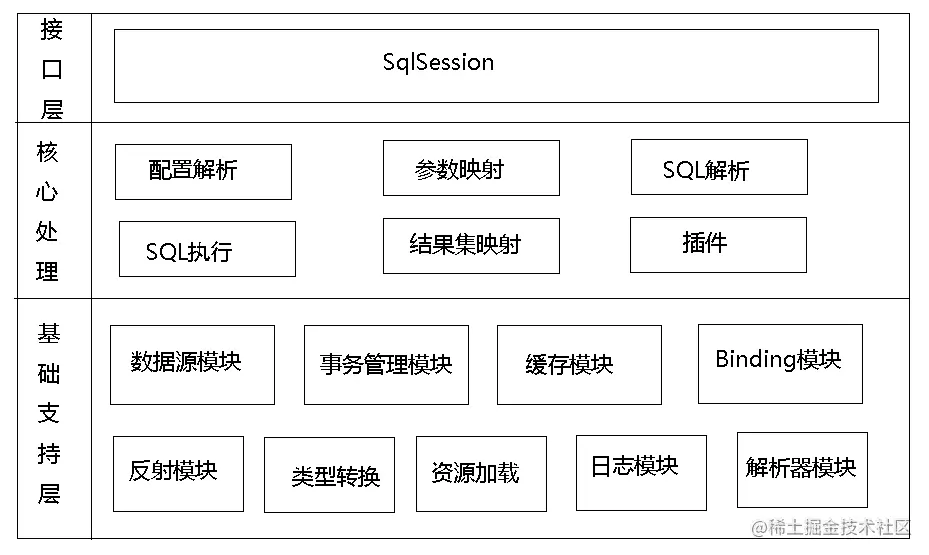 MyBatis的整体架构分为三层,分别是基础支持层、核心处理层和接口层