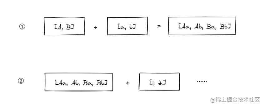 上面这道题,我们可以将问题拆解,依次将临近的两个数组进行组合,然后向后遍历组合,大致如图所示: