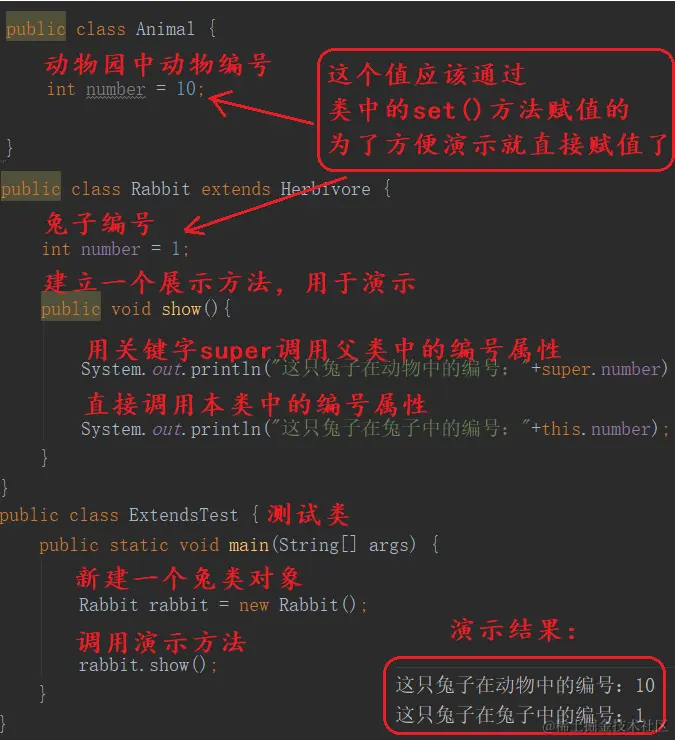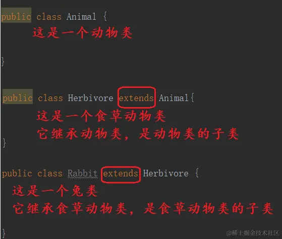 Java支持多层继承,兔类继承食草动物,食草动物继承动物( 爷爷类,爸爸类,可以统称为父类,超类)