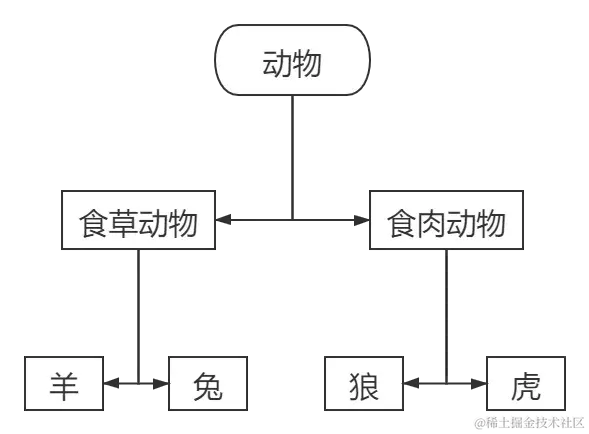 所以动物是一个类;食草动物、食肉动物都是动物的子类;羊类、兔类是食草动物的子类;狼类、虎类是食肉动物的子类。