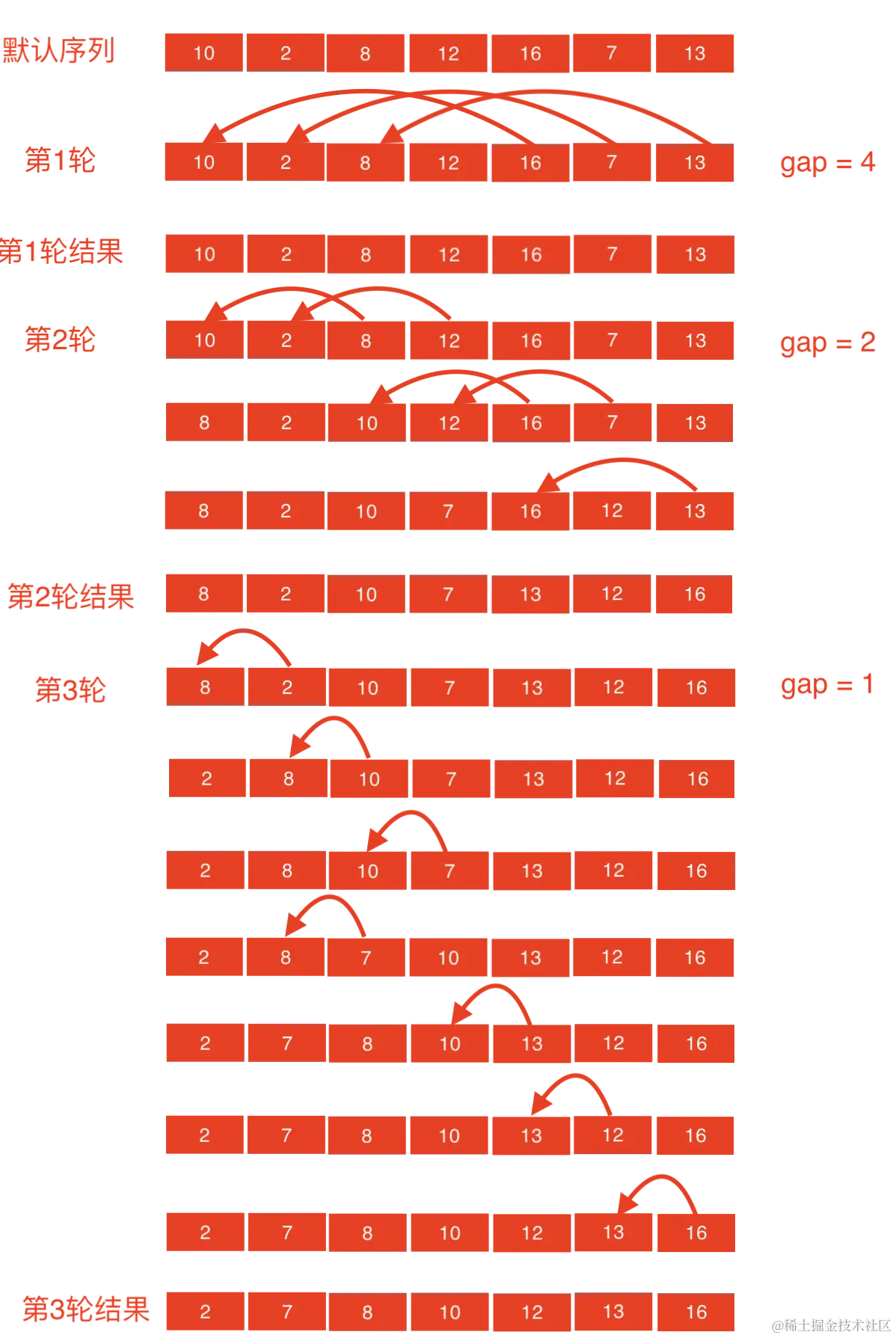 1.设置步长为gap(即向前比较的间隔),默认为半个列表的长度,每一轮减少为现在步长一半