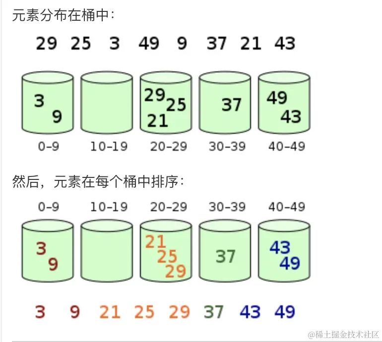 可以看出元素根据其值的关系,将每个桶分成若干个值一样的区间(桶),将符合条件的数字放入对应桶内,分别对桶内元素排序,拿出即可