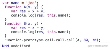 Function.prototype.call.call.call(A, 80, 70)Function.prototype.call.call.call(A, 80, 70)同B.call.call.call(A, 20, 10),按照第二步执行的结论可以得出将执行A(70),this => new Number(80),结果为res => NaN,this.name = undefined- 进行验证: