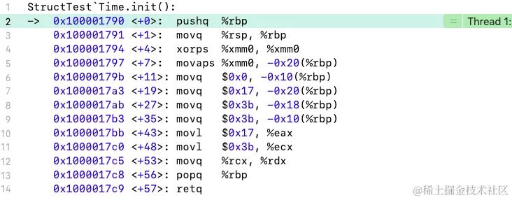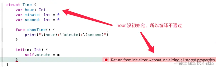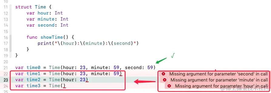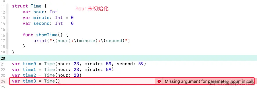 例如上面的 Time 结构体,定义中没有初始化 hour、minute、second,则在调用结构体初始化器的时候,三个参数均为必传参数,否则异常: