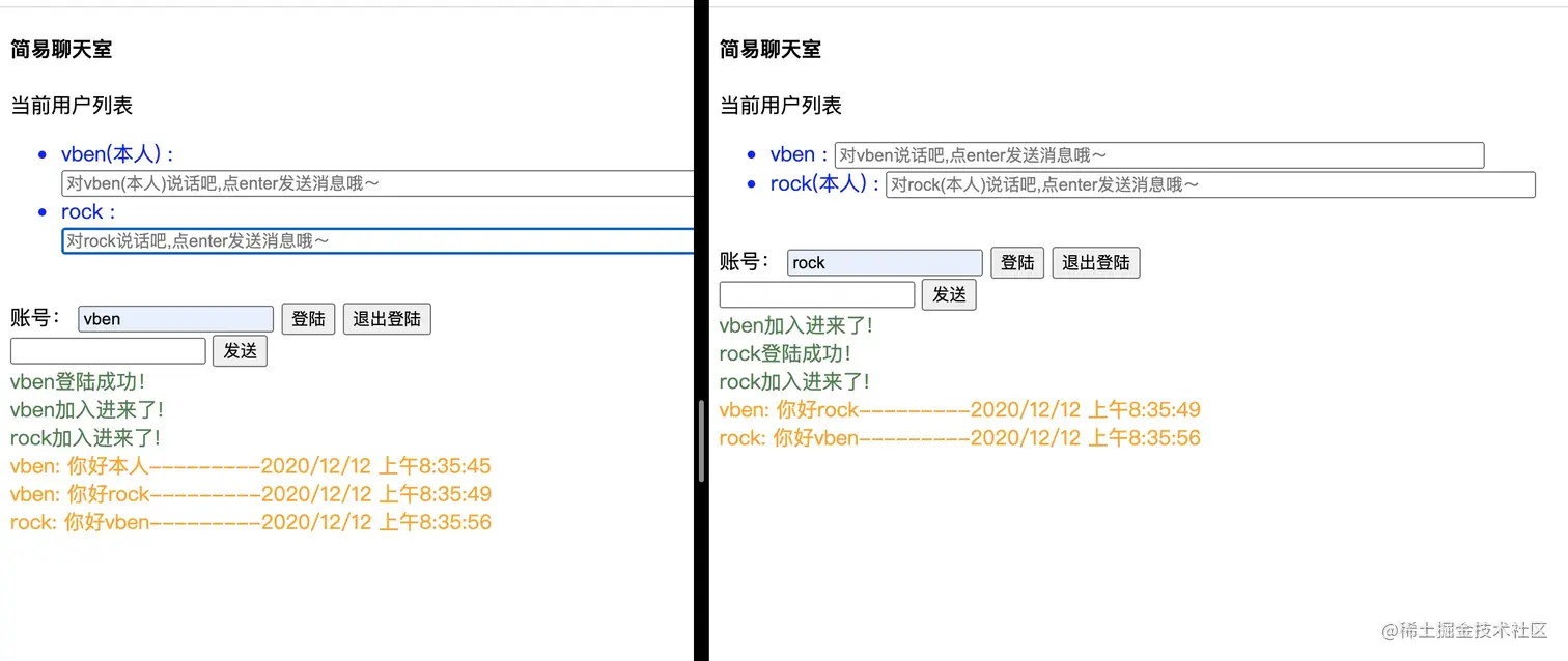 - 服务端通过socket.emit 发送给客户端登陆成功, 通过 io.emit 广播给所有客户端