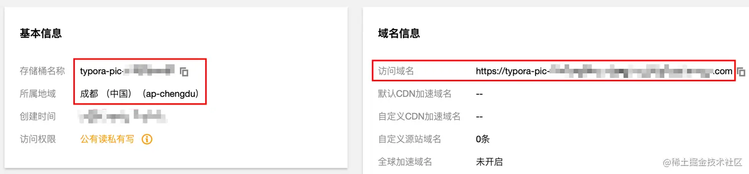 - 进入配置管理, 域名和存储地域为下图红框中内容.