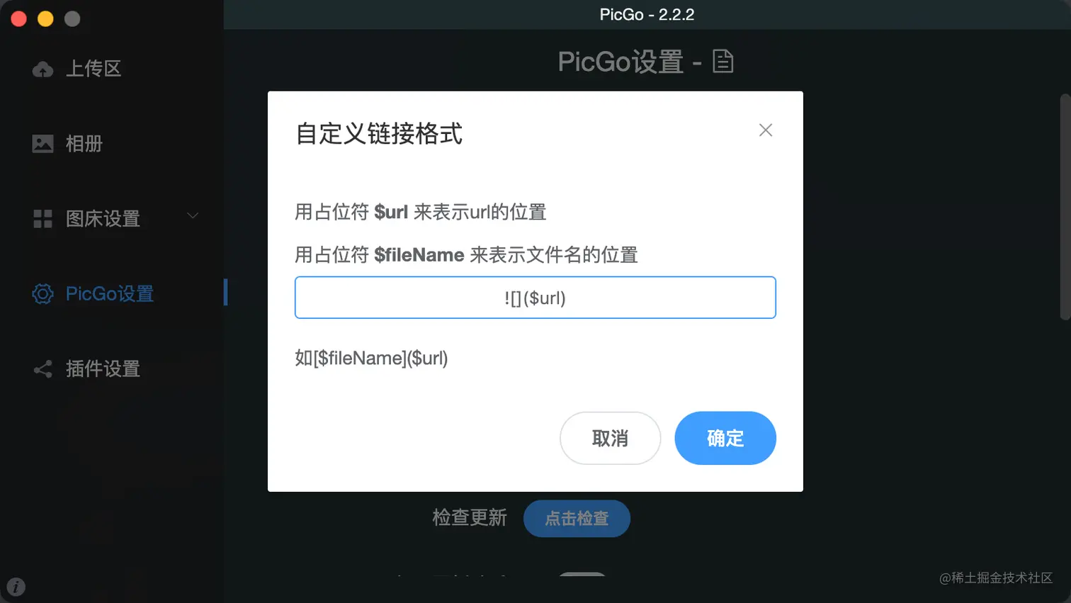 但是, 如果你要使用图片缩放, 那么就会变成html的img标签, 而不是md的图片链接, 这点要注意的. 然后你还可以设置上传后的md格式.