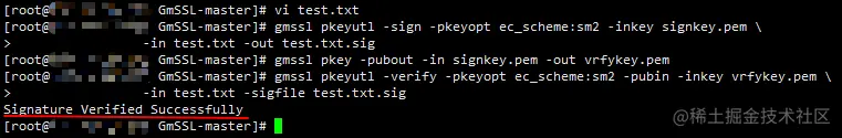 signkey.pem中导出并发布给验证签名的一方:$ gmssl pkey -pubout -in signkey.pem -out vrfykey.pem $ gmssl pkeyutl -verify -pkeyopt ec_scheme:sm2 -pubin -inkey vrfykey.pem \ -in <yourfile> -sigfile <yourfile>.sig看到红线处表示签名验证成功: