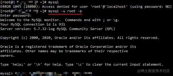 首先要进入 MySQL 服务,输入 mysql 发现报错:ERROR 1045 (28000): Access denied for user 'root'@'localhost' (using password: NO)。