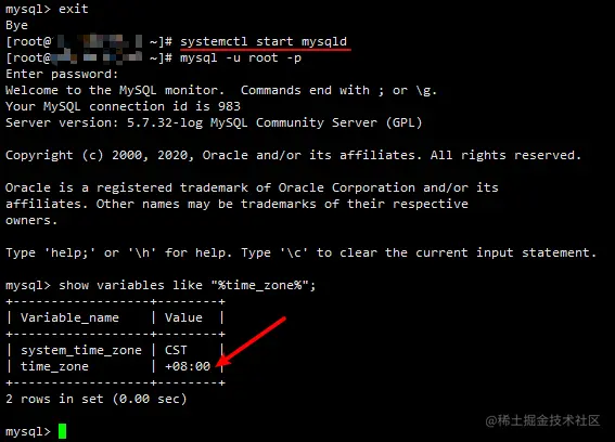 不放心就退出重启 MySQL 服务再查看一下时区: