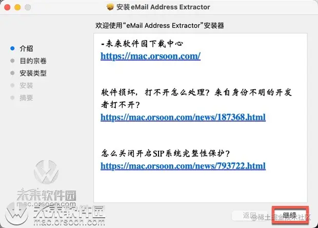 下载好eMail Address Extractor安装包后,双击安装包进行安装,弹出安装器后点击“继续”,如下图: