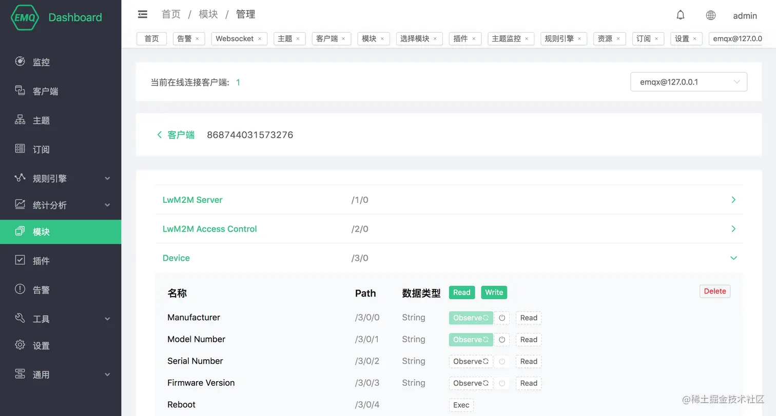 同时,该版本提高了 LwM2M 协议易用性,可以通过 Dashboard 可视化界面与 REST API 单独管理 LwM2M 连接,包括通过 LwM2M 协议接入 EMQ X 的客户端列表以及对应的 Object 和 Resource。