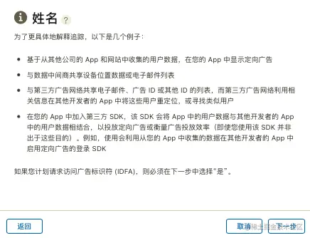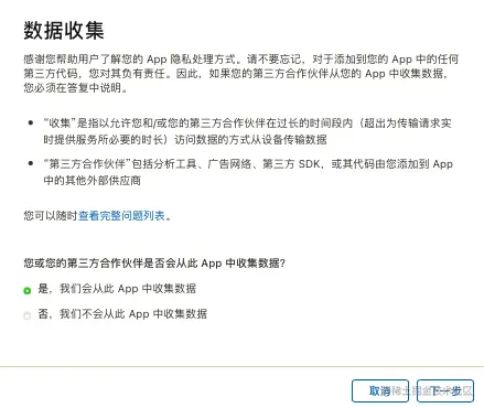 最近遇到无法提交审核,苹果要求先在“App 隐私”中提供信息收集的相关信息:
