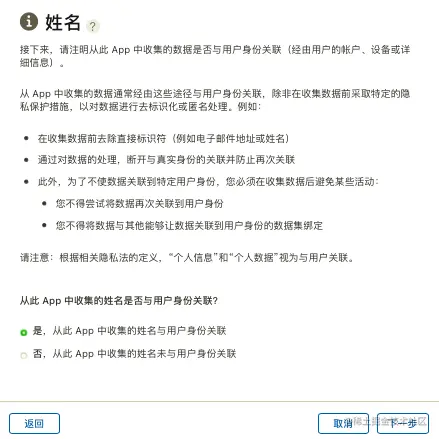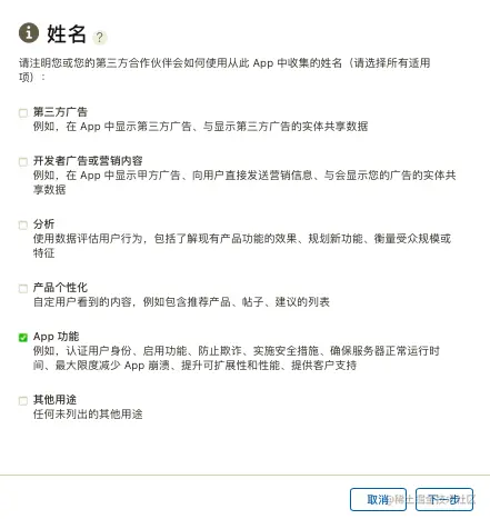 我主要是用到了姓名做身份认证,所以勾选了“App功能”选项