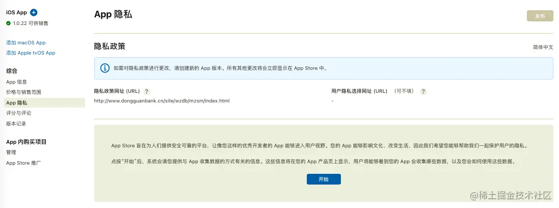 1、直接在发布平台点击进入“APP隐私”模块,点击“开始”