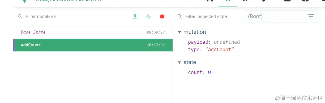 commit设置的mutations时,可能mutations时里需要请求数据异步操作,那么异步状态无法追踪,dev-tool就无法实时获取到真实的快照,为了解决这个竞态。vuex采用了action中间状态,在action中处理异步,在action的异步状态触发commit设置的mutations。执行了一个异步操作mutations中,将不会打印出准确的快照,count还是初始值。