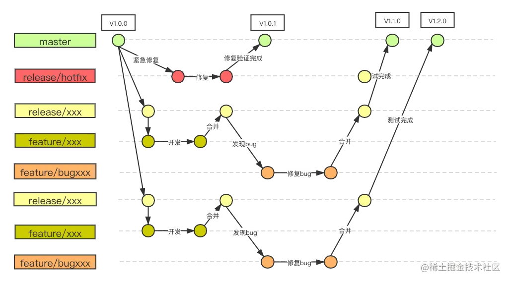 feature/bugxxx:功能类似feature/xxx,单独列出只是为了说明测试阶段的bug修复都是从release/xxx切分支出来改bug