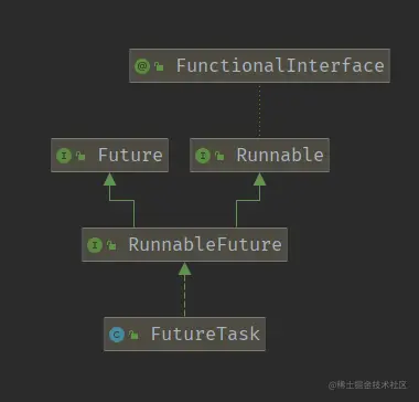 这里我们就要借用另一个类FutureTask,这个类实现了RunnableFuture接口,且该接口继承了Runnable接口,同时,这个类的构造方法刚好需要传入Callable接口的实现类;