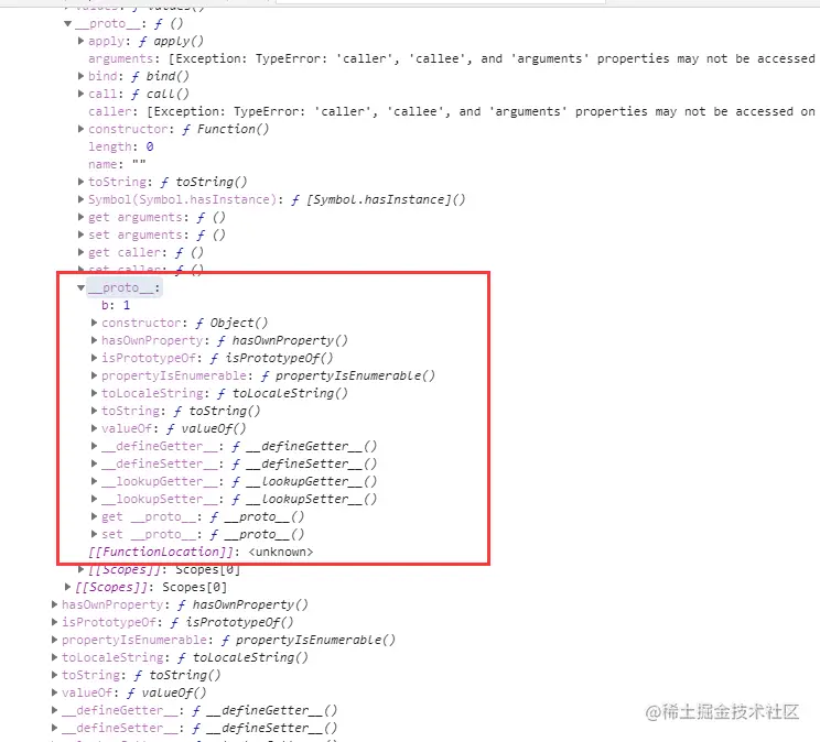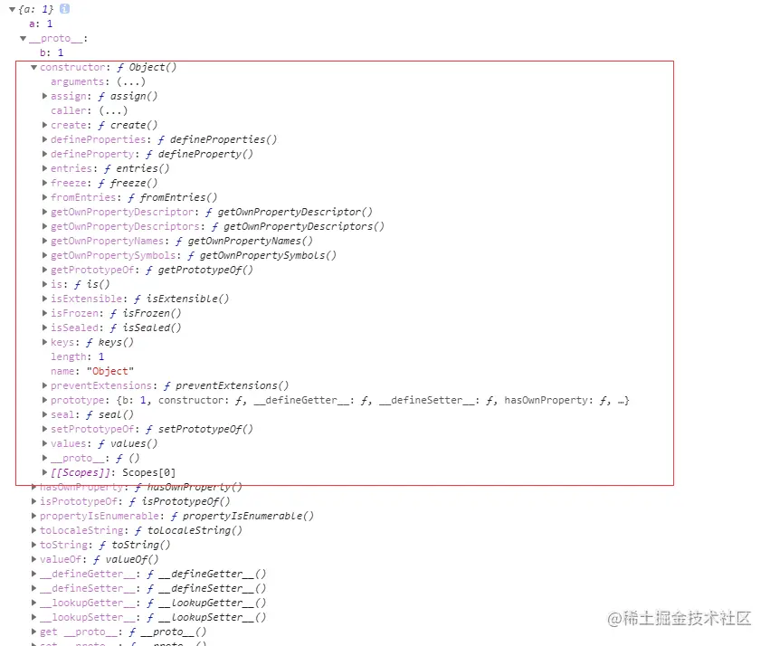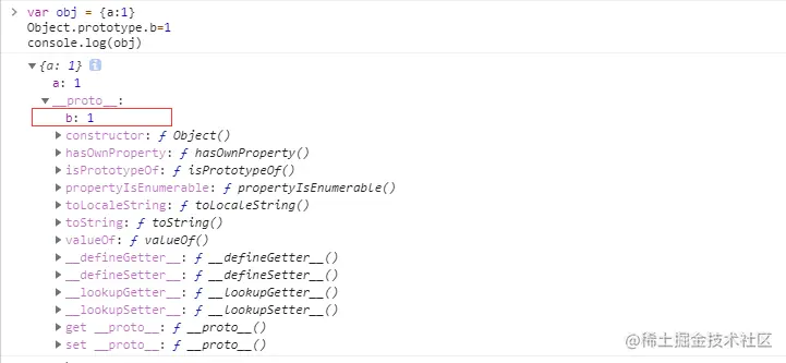 我们在Object的原型对象上创建一个属性b,通过控制台打印obj,obj的__proto__指向创建他的构造函数Object的prototype对象。