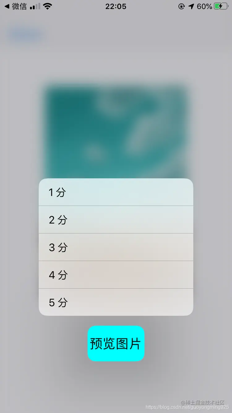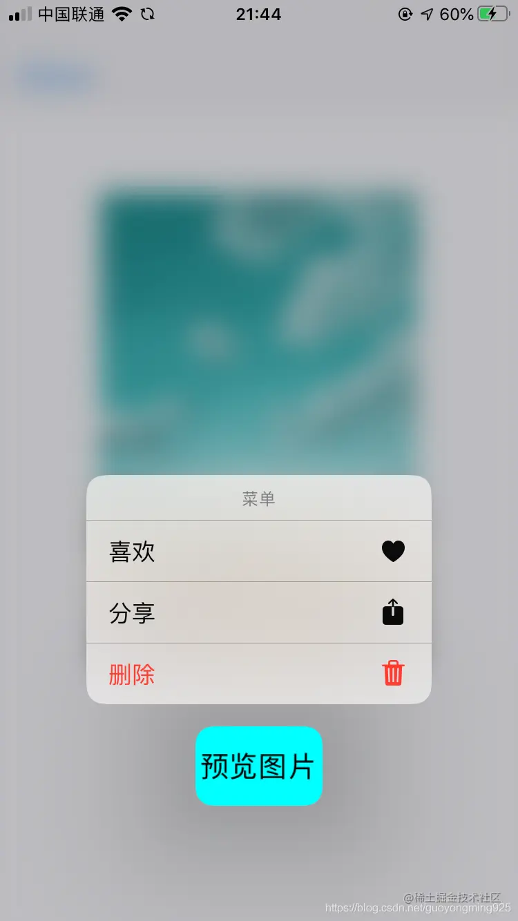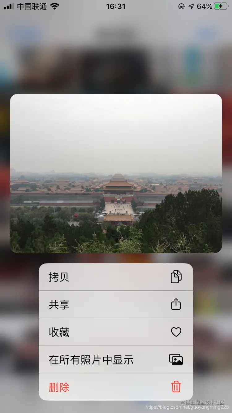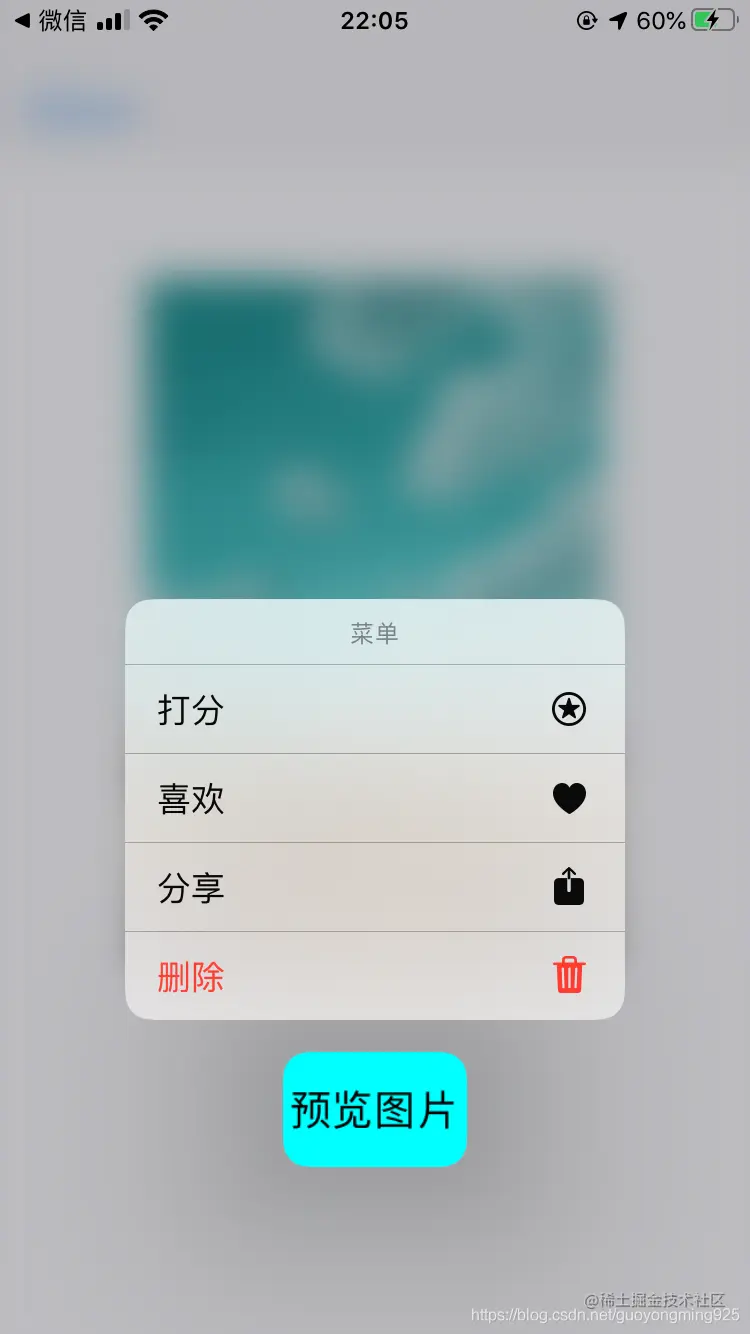 图中,长按后弹出一个预览视图,底部带有操作选项列表,周边全部虚化,如果点击预览图,则可进入全屏界面查看图片。