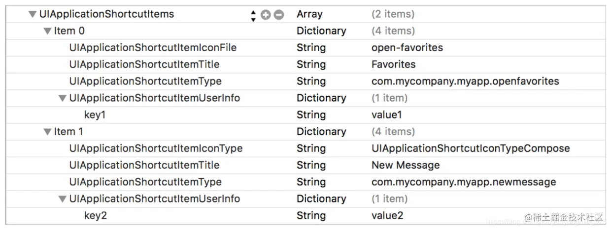 | UIApplicationShortcutItemType | 必填 | 快捷操作项的唯一标识,用于区别其他快捷操作项。 |