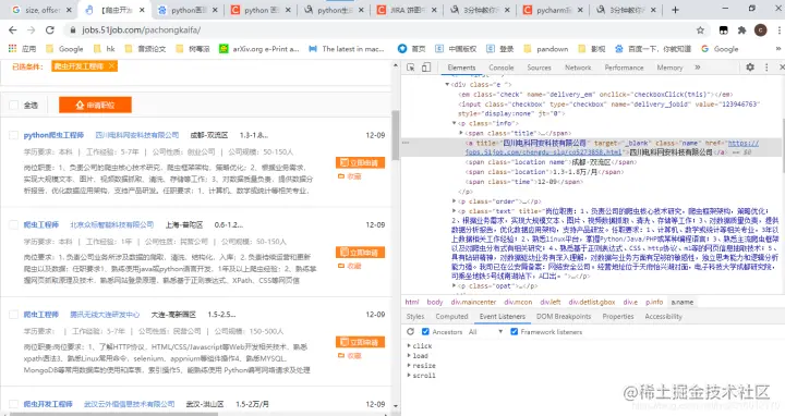 2.分析目标网站的标签,发现想要的字段(岗位、公司名称、城市、薪资)都在p标签里面,如下图
