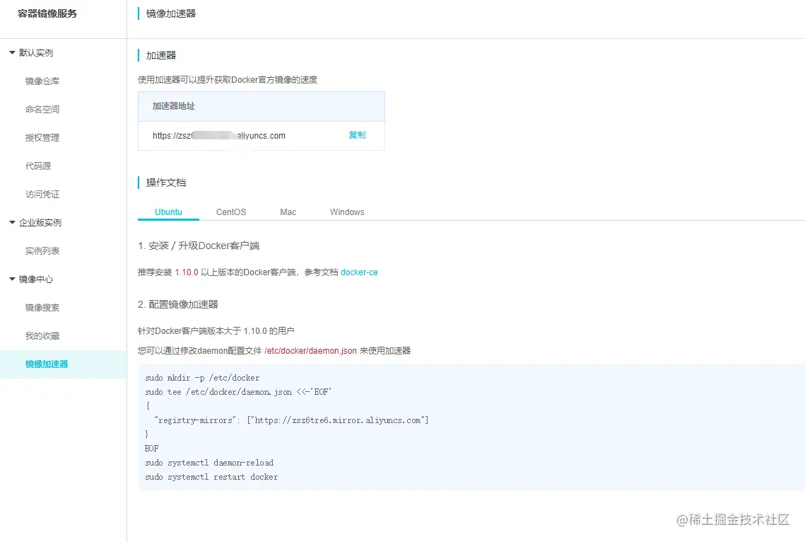 - 单击【镜像中心】 > 【镜像加速器】,可以看到阿里云提供了一个专属的镜像加速地址。