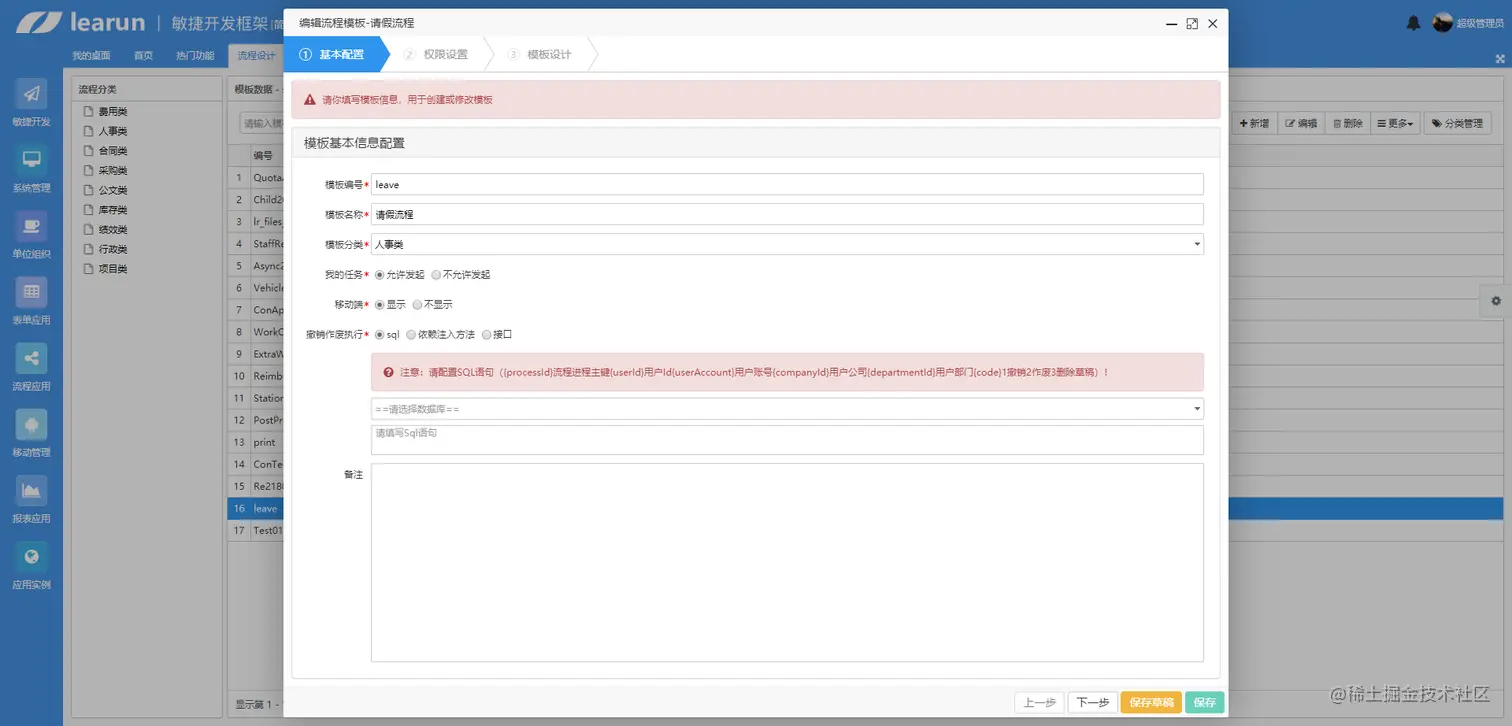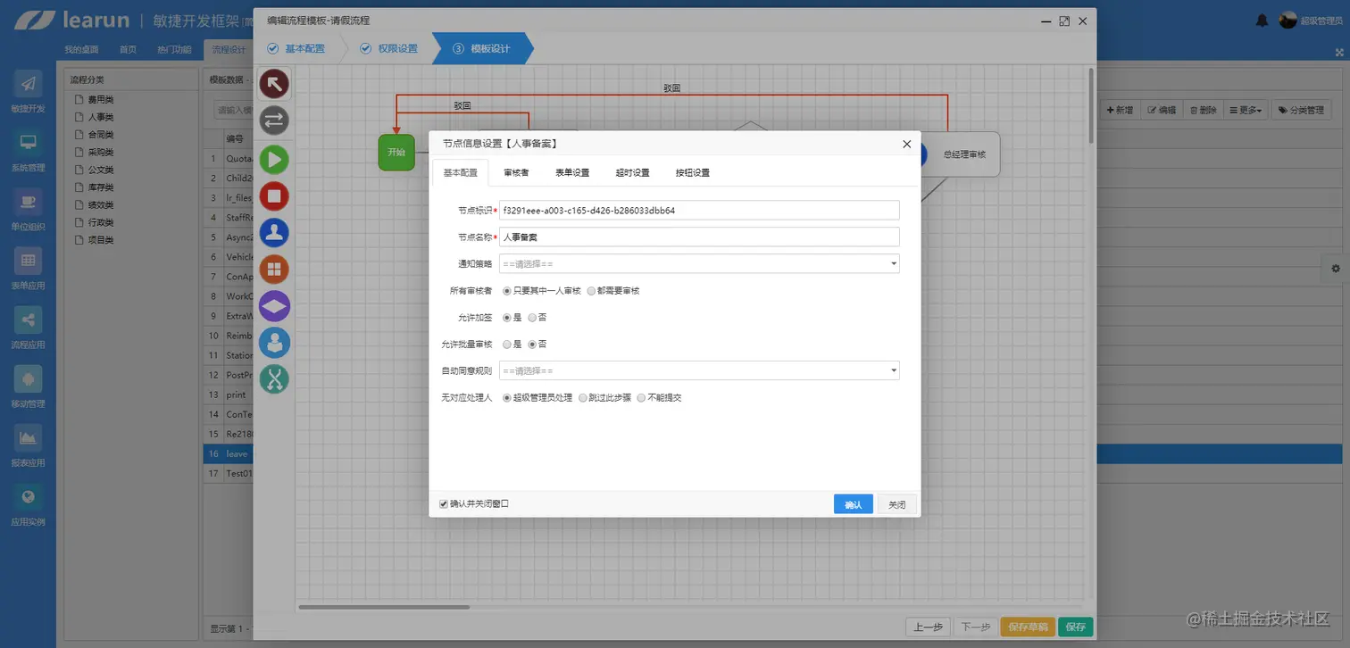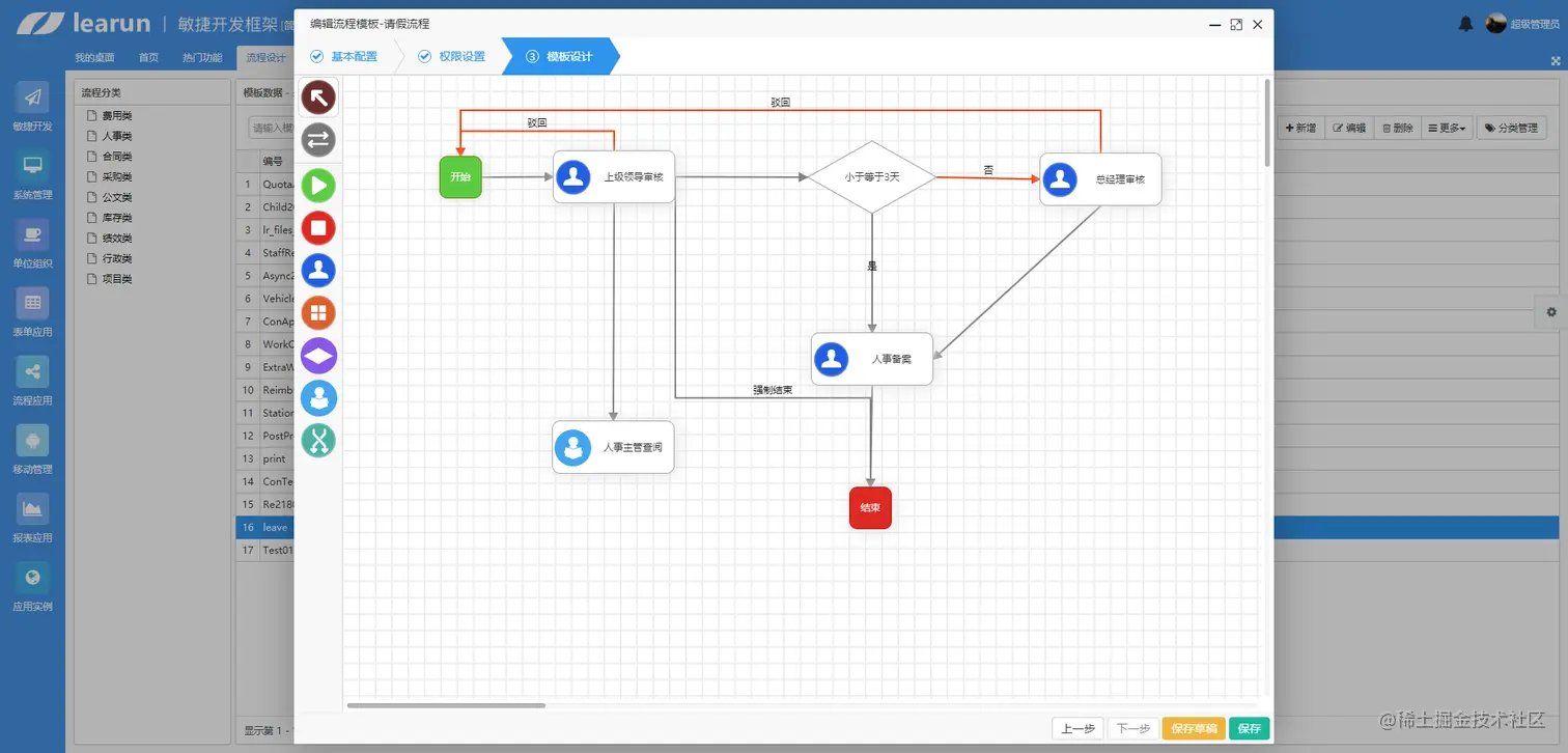 流程模块演示:这里使用Learun FrameWork流程模块展示请假流程开发,全程鼠标可视化操作,便捷性很高,个性化需求可以在VS中进行代码修改。