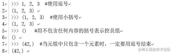 元组:不可修改的序列,包括字符串,创建方法也很简单,用逗号隔开或小括号即可创建一个元组。