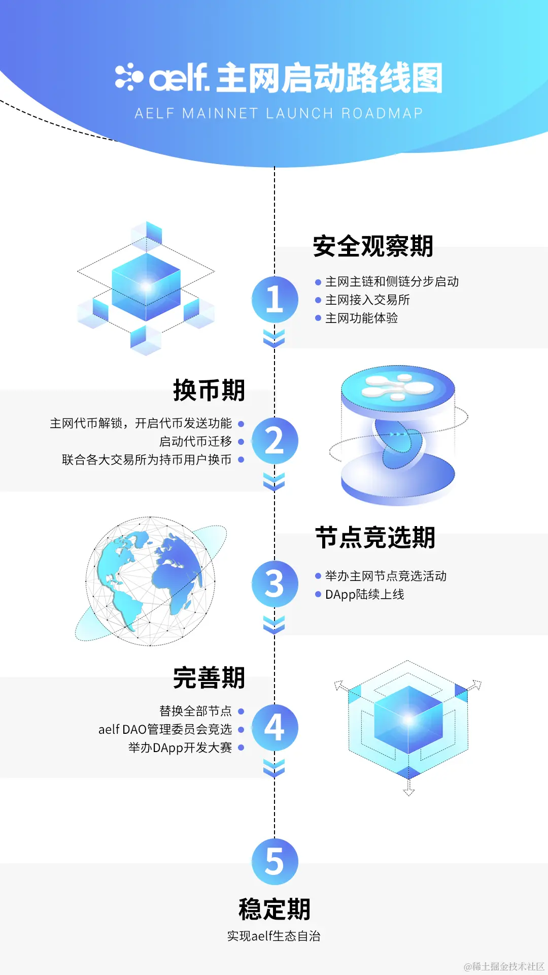 第五阶段,aelf主网已经完全稳定,能够实现社区自治、生态自治。