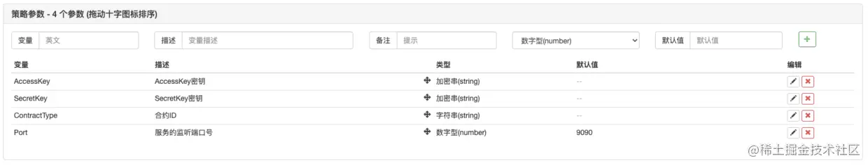 - 类型:加密字符串,AccessKey , SecretKey ,可以用FMZ平台的低权限的API KEY,或者自己生成KEY也可以。