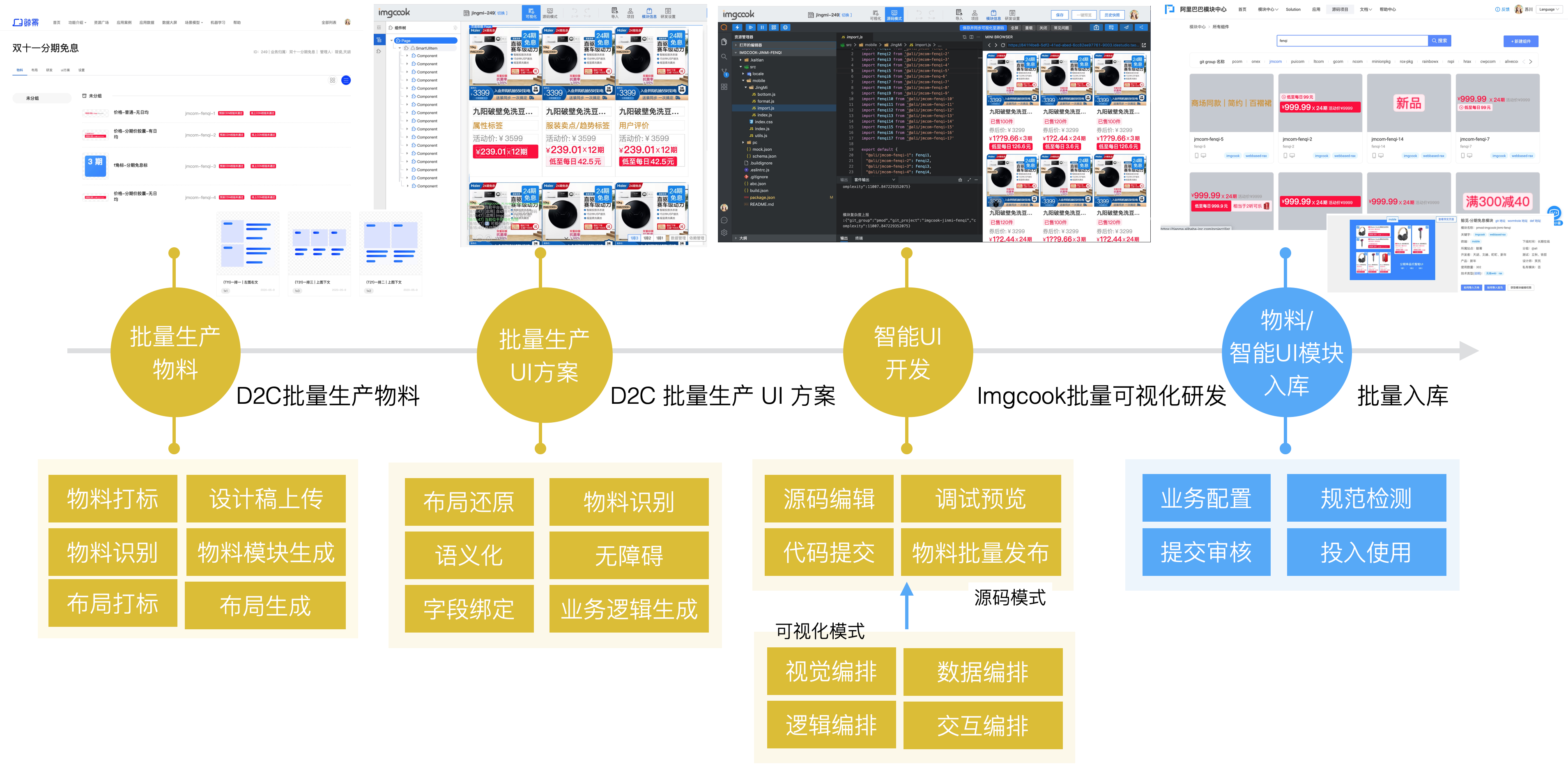 基于对模块内区域元素的拆解,前端开发时产出小粒度的物料,渲染SDK再把物料拼装在一起实现一个前台模块。由于物料被拆解的足够细,单个物料非常小巧,只需要处理UI样式和简单的业务逻辑。这种简单的物料非常适合借助imgcook实现批量生产。这次双11我们升级了智能 UI 的研发链路,使用imgcook可视化研发承接智能 UI 的批量化生产。设计师上传视觉稿,imgcook从视觉稿中解析出 UI 物料。所有UI物料在同一个画布上开发编辑,最后将物料批量发布。借助物料的一体化研发链路,前端生产过程高效了很多。