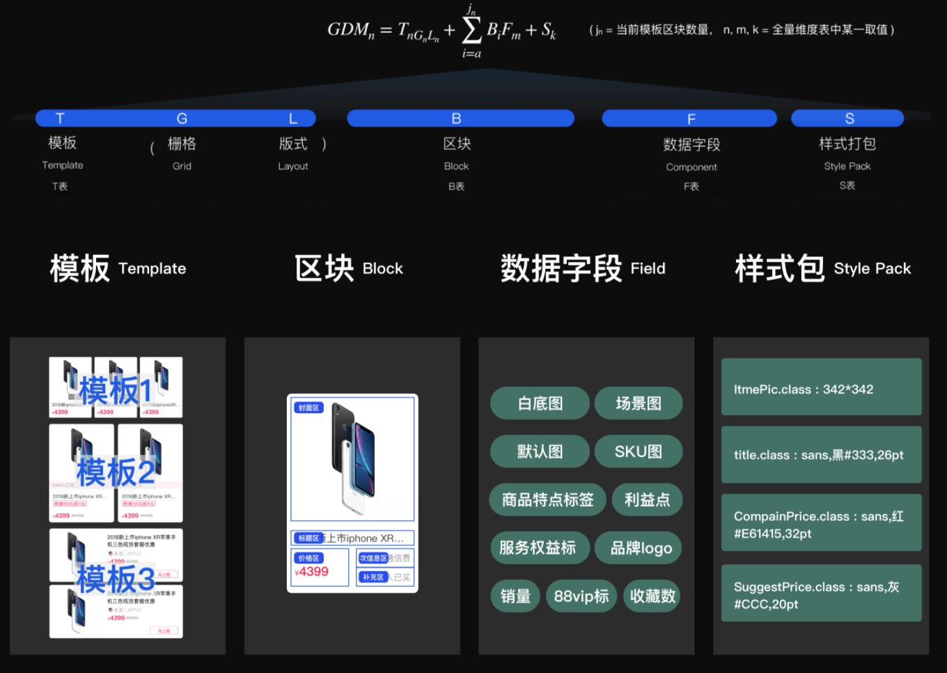 通常来说,设计数据由于难以结构化的问题,一直很难应用到实际场景中。但随着网络购物习惯的培养,电商场景下的许多常用模块,都是可以逐渐结构化的。因为这些模块的功能目的、形态和表现形式都形成了一定的事实标准。通过对大量线上页面的研究,智能UI设计团队总结并提出了描述电商模块设计方案的模型GDM。GDM包含了界面的栅格、布局、样式信息等,具体定义见下图。