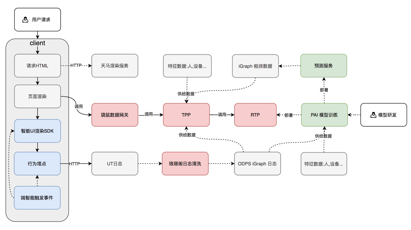 为了更好的提升推荐效果,今年双11我们决定自建推荐算法进行方案推荐。以往我们与搜索推荐算法团队合作时采用的算法模型是根据方案实时点击情况进行排序打分。基于实时点击排序的算法模型根据不同UI方案点击情况进行好坏的评判,本质上是一个基于实时数据进行未来方案点击率预测的模型。算法并没有理解到不同UI的差异性,哪个UI方案好,为什么好,也没办法进行归因分析。而且在流量较少的情况下很容易出现效果的大幅度波动。 当我们从前端开发者的角度重新思考智能UI推荐算法时,我们的思路是要让算法能够理解UI。所以我们自建算法的初衷是想要增强算法对于UI和用户行为的理解。基于模型对UI和用户的理解进行相关方案的推荐。自建智能UI推荐算法区别于普通推荐算法的两个点: 一是将端上行为数据(用户实时行为包含:点击次数,浏览深度,滑动频次,停留时长等)加入到了模型中,根据用户在APP内的实时行为对用户进行初步分类,然后结合云端算法数据综合性判断应该展示哪种UI。 二是增加了物料的UI属性输入,通过UI属性的输入可以让算法模型建立不同物料间的联系。这样可以让算法更好的理解不同物料间的差异性和关联性,在低流量场景下也可以推荐出相对优质的方案。
