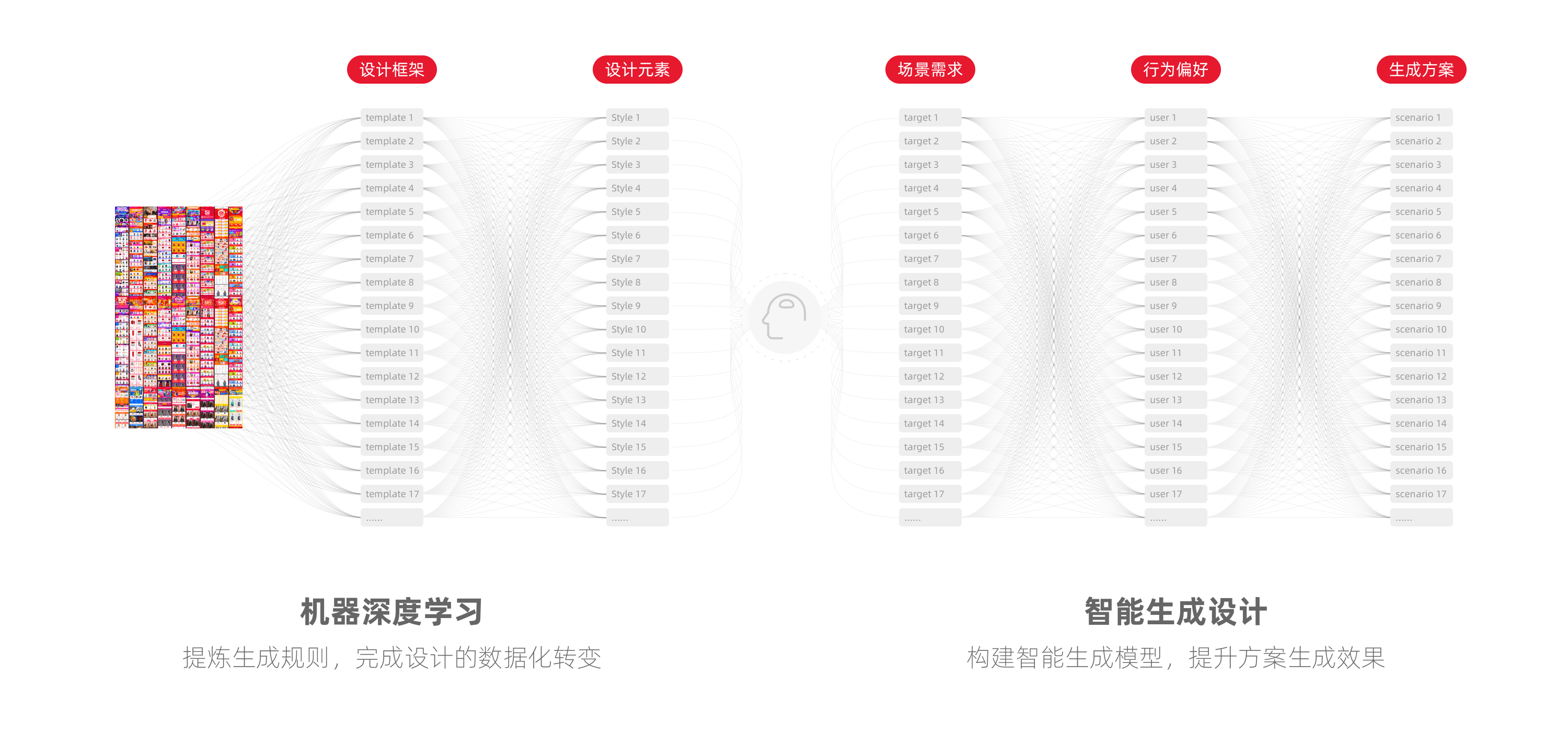 当我们有了完整的智能UI数据化闭环,我们接下来会和设计团队一起探索智能生成的落地。旨在将AI等新技术引入设计行业,透过机器学习,将预设的UI组件、UI模版等UI设计素材,根据设计规则、展现逻辑、用户数据和算法模型进行排列组合,从而获取符合业务需求和设计审美的规模化UI方案的方式,以达到为用户提供个性化的浏览界面的最终目标。 要达到设计表达智能生成的目标,有两个重要方面:第一,提炼智能生成规则。将设计效果抽象成机器能够理解的规则,通过深度学习,完成设计数字化的转变。设计效果包含页面结构、商品素材、描述字段、风格样式等因素。第二,构建智能生成模型,建立生成规则、用户行为、场景需求和数据结果之间的映射关系。这就需要建立“生成规则-用户行为-场景需求-数据结果”的数据模型,为每个用户、 内容和UI表达之间进行权重打分,透过用户点击、停留时间、浏览转化、下单成交等行为来评价用户对推荐内容和呈现界面的满意度之后,再通过机器学习去训练,最后为每个用户都提供专属的、个人化的浏览界面。