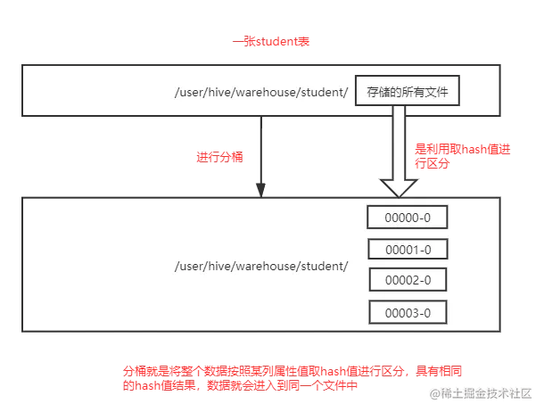 分桶就是将整个数据内容按照某列属性值取hash值进行区分,具有相同hash值的数据进入到同一个文件中。