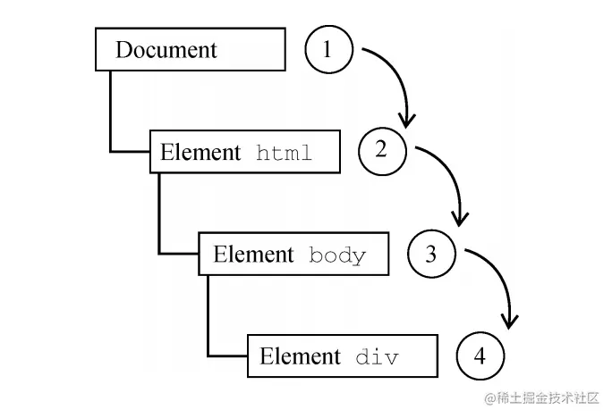 Netscape Communicator团队提出了另一种名为事件捕获的事件流。事件捕获的意思是最不具体的节点应该最先收到事件,而最具体的节点应该最后收到事件。事件捕获实际上是为了在事件到达最终目标前拦截事件。也就是他的顺序是从最上层那个父节点开始,一直到最小的具体节点。