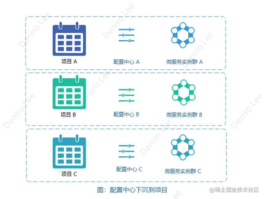 一个项目对应一个配置中心。如果有多个项目那么对应多个配置中心。也就是把配置中心下沉到项目中。这样做的好处是: