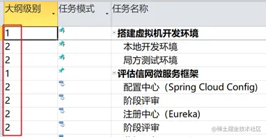 首先我们需要任务之间的层级关系数据。Microsoft Project 中的“大纲级别”字段描述的就是任务之间的层级关系: